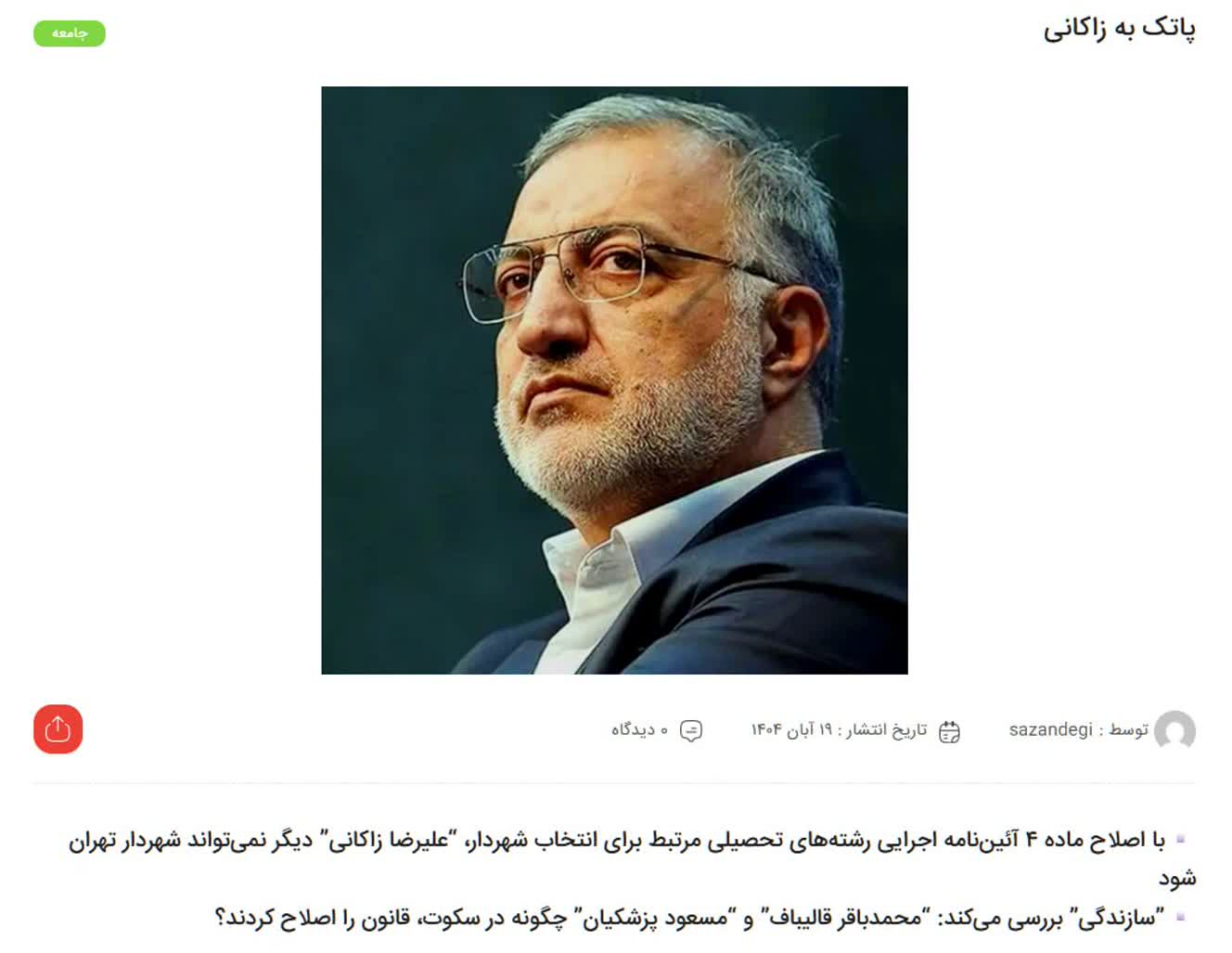 مومنی، مشاور رسانه‌ای امانی، عضو شورای شهر تهران(نزدیک به قالیباف) در روزنامه اصلاح طلب سازندگی نوشته است که قالیباف و پزشکیان در سکوت، قانون انتخاب شهردار تهران را اصلاح کردند. با اصلاح ماده ۴ آئین‌نامه اجرایی رشته‌های تحصیلی مرتبط برای انتخاب شهردار، علیرضا زاکانی دیگر نمی‌تواند شهردار تهران شود.
