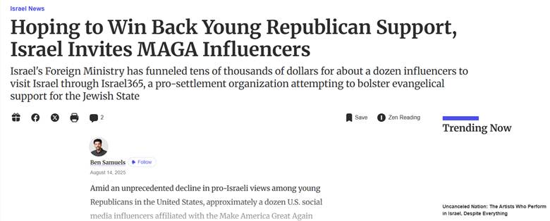 در همین راستا، نخستوزیر رژیم اسرائیل گروهی از اینفلوئنسرهای طرفدار جریان «MAGA / America First» را به سرزمینهای اشغالی دعوت کرد. حدود ۱۵ اینفلوئنسر ایالات متحده را که دنبالکنندههای قابل توجهی هم دارند، به اسرائیل فراخوانده شدند تا بازدید از سایتها، اماکن و مناطق تحت تأثیر عملیات ۷ اکتبر حماس داشته باشند و سپس تجربیات خود را در شبکههای اجتماعی به اشتراک بگذارند. هدف از این اقدام این بود که روایت حامیان اسرائیل در میان مخاطبان آمریکایی افزایش یابد، بهویژه وقتی که حمایت عمومی از اسرائیل در جنگ غزه تقریبا سقوط کرده بود.