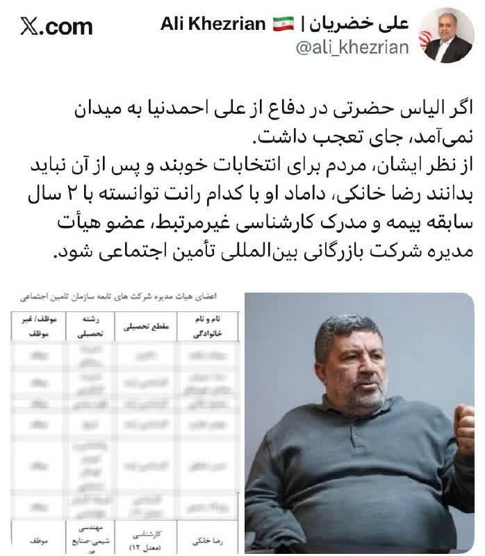 خضریان: داماد حضرتی با کدام رانت عضو هیات مدیره شده است؟