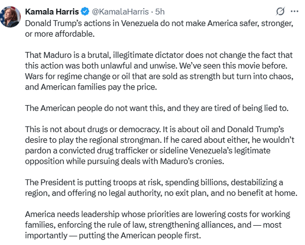 هریس در پستی در شبکه اجتماعی ایکس، اقدام اخیر ترامپ در دستگیری مادورو را اقدامی «غیرقانونی» و «غیرعاقلانه» توصیف کرده است. او تصریح کرده که این اقدام، آمریکا را کشوری «امنتر، قدرتمندتر یا مقرونبهصرفهتر» نخواهد ساخت.